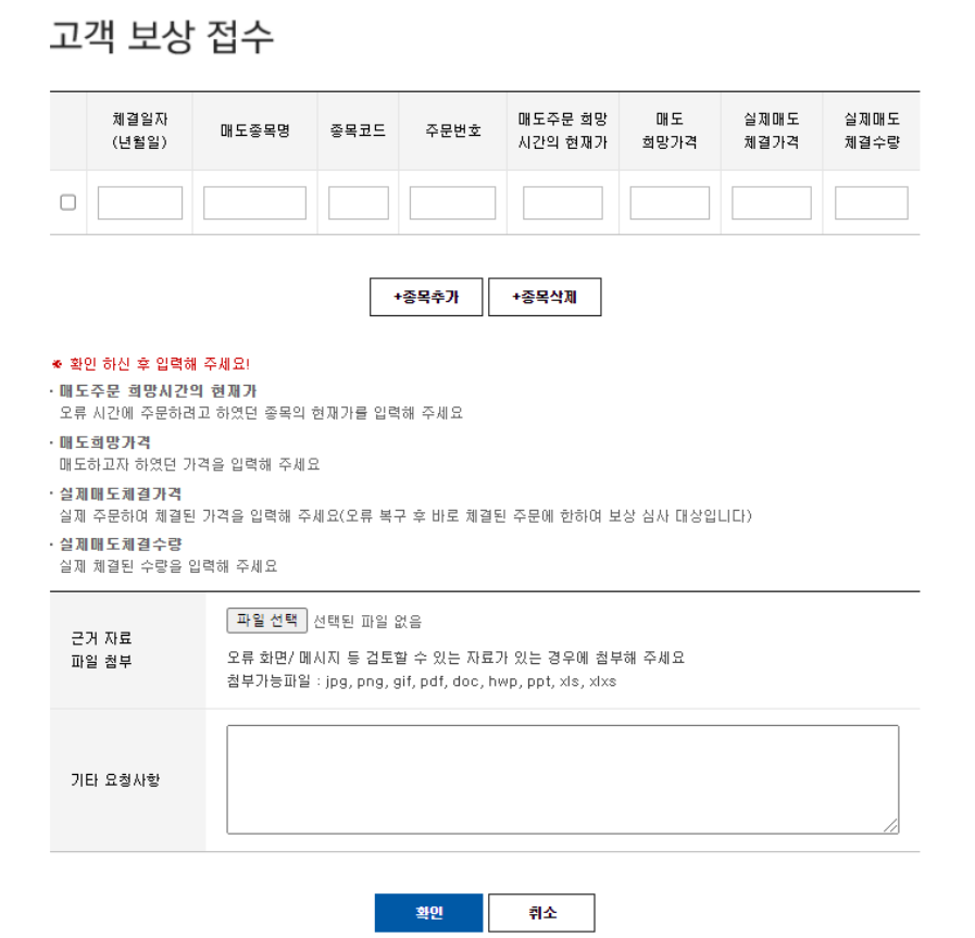 전화 기록 또는 로그기록 등을 남기신 고객의 주문가격이 주문시점으로부터 장애 복구 시까지 체결이 불가능한 가격일 경우에는 보상에서 제외됩니다.