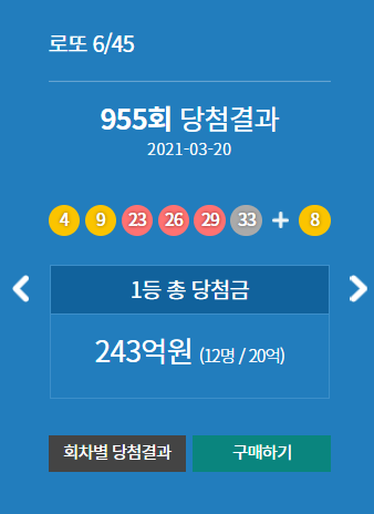 | 954회 로또 당첨번호 🔺1등 25억 (+당첨지역) (0) | 2021.03.14 |