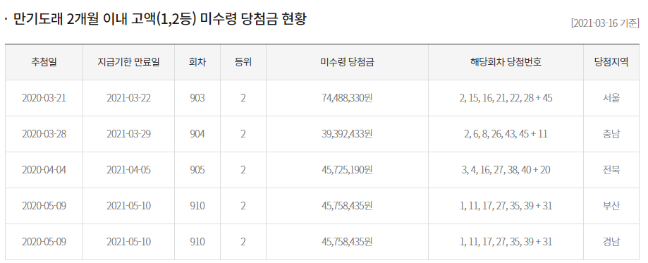 당첨금 지급 만료기한까지 수령되지 않은 미수령