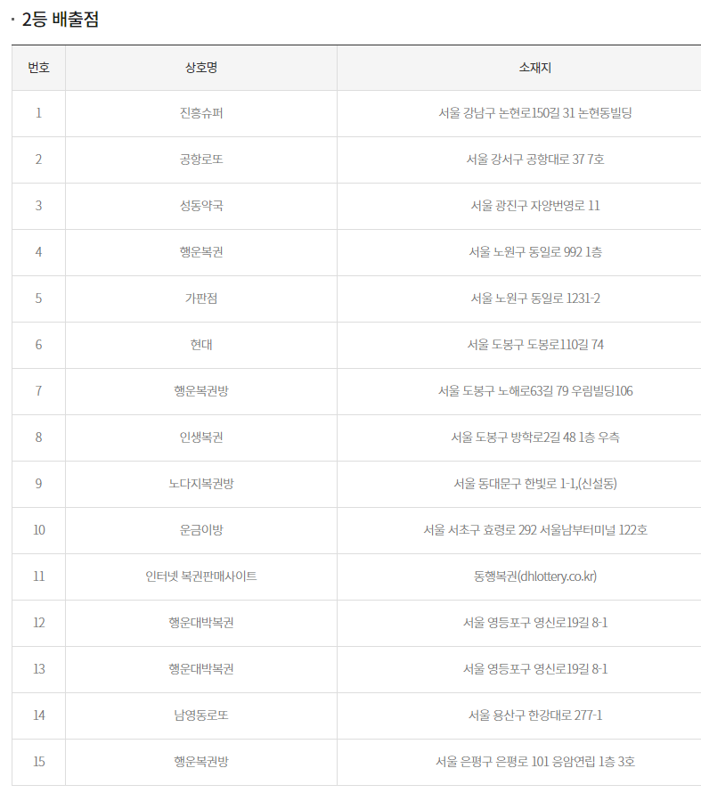 1등, 2등 당첨지역 당첨판매점은 아래와 같습니다.