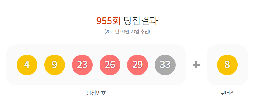 '4, 9, 23, 26, 29, 33'가 1등 당첨번호입니다.
