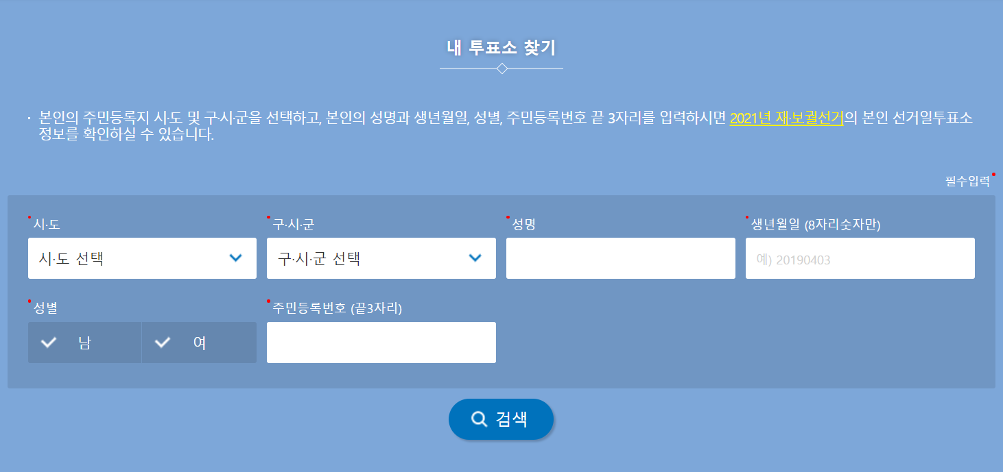 본인의 주민등록지 시·도 및 구·시·군을 선택하고, 본인의 성명과 생년월일, 성별, 주민등록번호 끝 3자리를 입력하시면 2021년 재·보궐선거의 본인 선거일투표소 정보를 확인하실 수 있습니다.