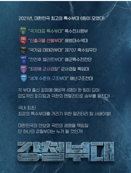 2021년 3월 23일부터 채널A와 SKY에서 방영 중인 밀리터리 서바이벌 프로그램입니다. 최정예 군 특수부대 출신 예비역들이 4인 1조로 팀을 이뤄 각 부대의 명예를 걸고 대결을 펼쳐집니다. 최종 참가 부대는 특전사, 해병수색대, 707, UDT, SDT, SSU 등 총 6팀으로 특히 이번화는 UDT 육준서가 해병대수색대와의 경주에서 긴장감을 내보였습니다.