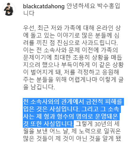 박수홍은 검은 고양이 다홍이의 인스타그램에 “최근 나와 가족에 대해 온라인 상에 돌고 있는 이야기로 많은 분들께 심려를 끼친 점 진심으로 사과드린다”라며 “이는 전 소속사와 문제 이전에 가족의 문제이기에 최대한 조용히 상황을 매듭지으려 했으나 부득이하게 이 같은 상황이 벌어지게 돼, 걱정하고 응원해주는 분들을 위해 어렵게나마 이렇게 글을 남긴다”라고 밝히며 개인 SNS에 제기된 논란이 모두 사실이라고 인정하면서 박수홍은 전 소속사와 관계에서 금전적 피해를 입은 것은 사실이며, 소속사가 본인의 형과 형수의 명의로 운영돼 온 것 또한 사실이라며 마지막 대화 요청 후 응하지 않는다면 더 이상 형네 집안을 가족으로 볼 수 없겠다는 얘기를 올립니다.
