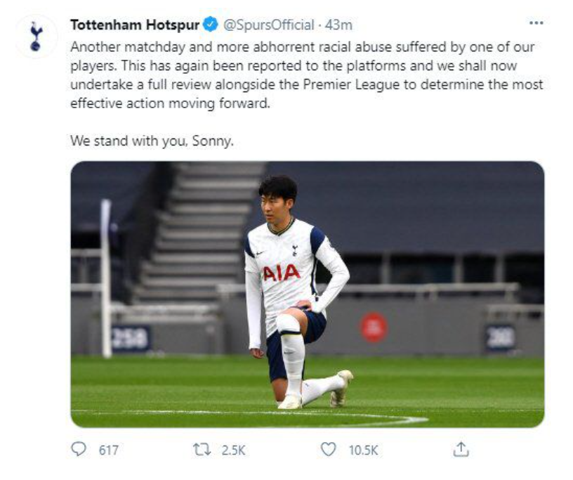 토트넘은 경기 후 공식 계정을 통해 "우리 선수 중 한 명이 끔찍한 인종차별을 당한 것으로 확인됐다"며 "프리미어리그 사무국과 함께 확인에 나설 것이고 이를 통해 가장 효과적인 조치를 찾아내겠다"고 밝혔다. 또한 토트넘은 "손흥민, 우리는 당신과 함께한다"며 응원과 연대의 메시지도 덧붙였습니다.