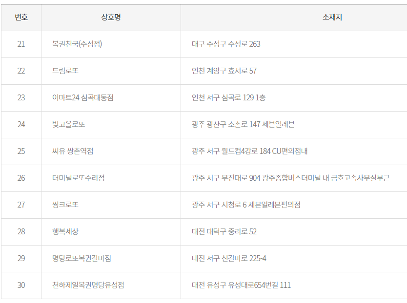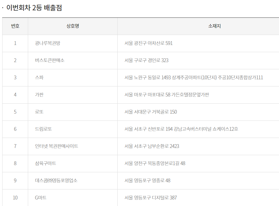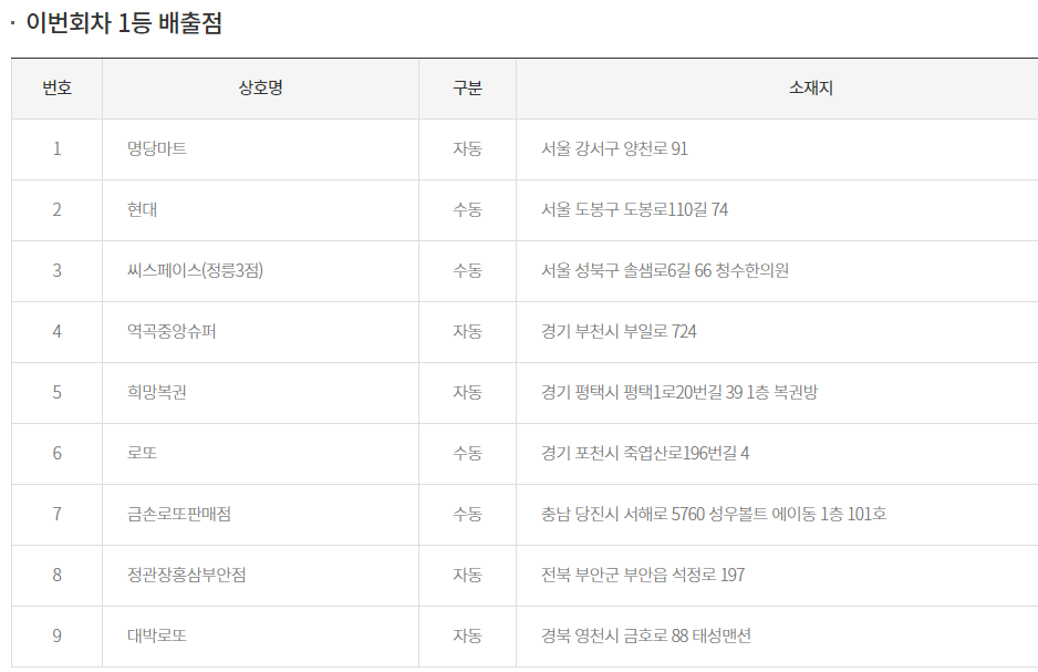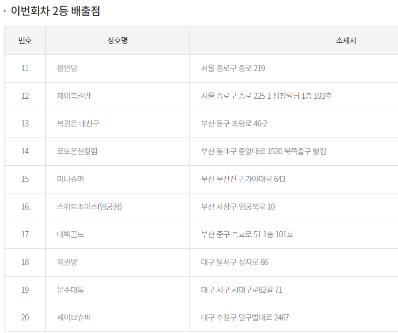 1등, 2등 당첨지역 당첨판매점은 아래와 같습니다.