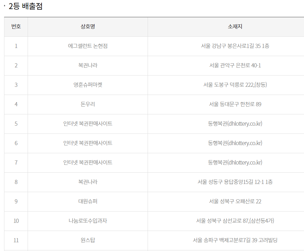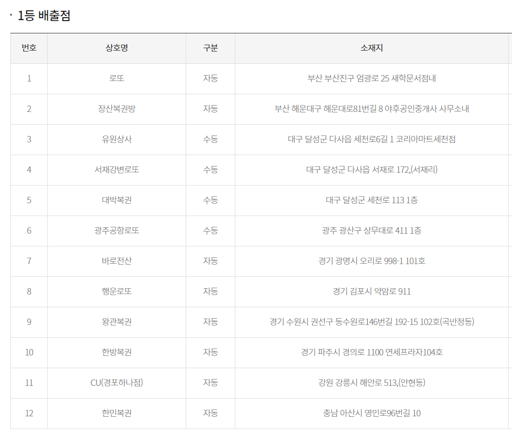 1등, 2등 당첨지역 당첨판매점은 아래와 같습니다.