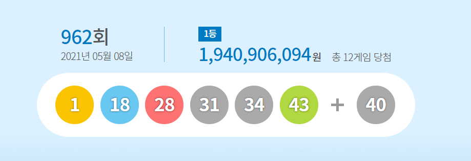 추첨 결과 로또962회 1등 당첨번호는