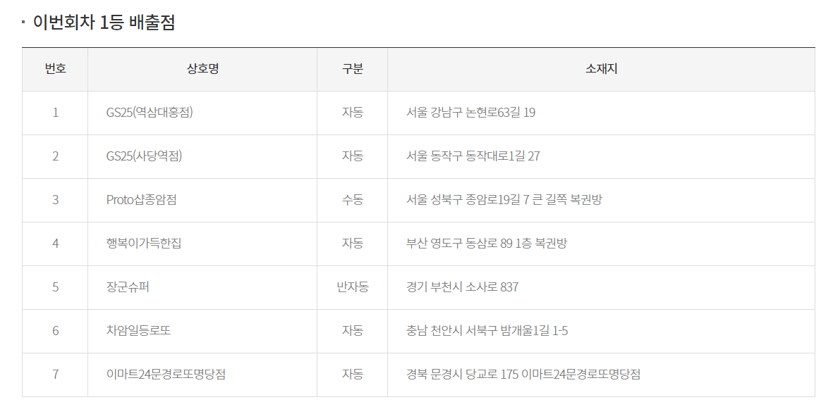 1등, 2등 당첨지역 당첨판매점은 아래와 같습니다.