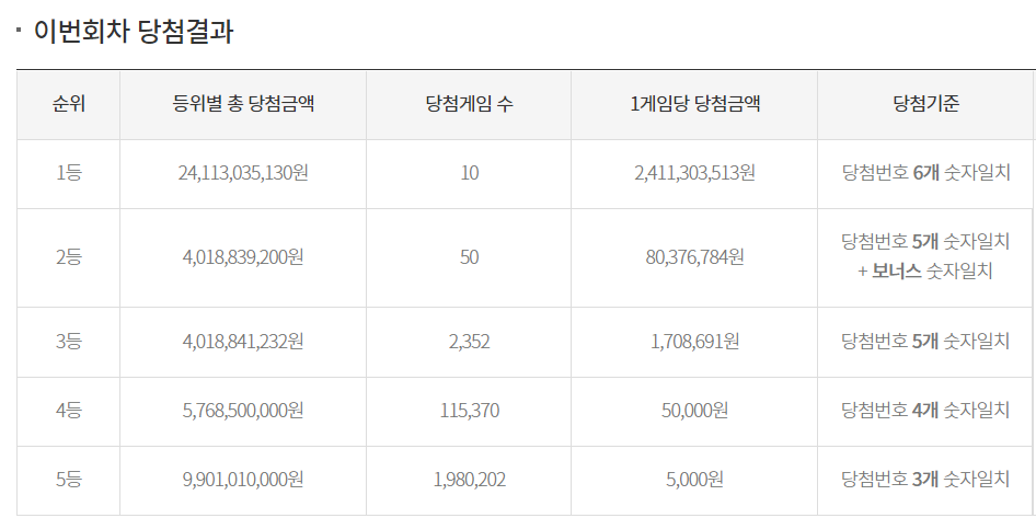 4개 번호를 맞춘 4등 11만5370명은 5만원씩을 받습니다.