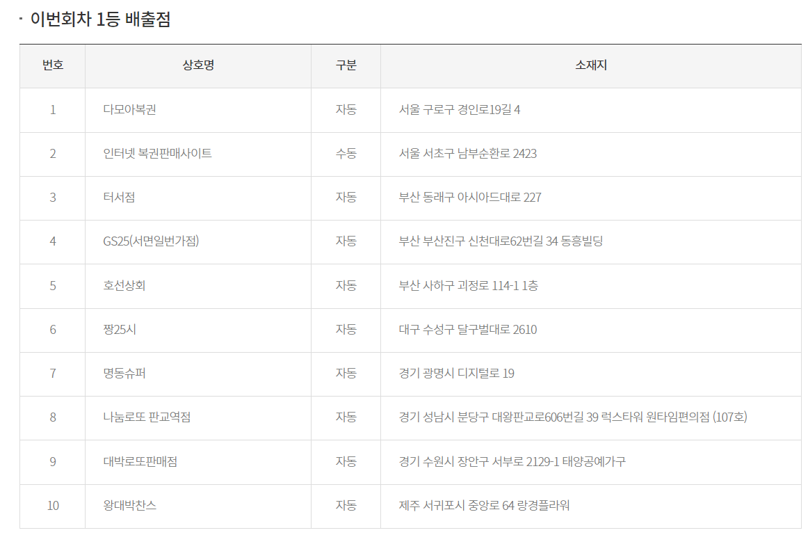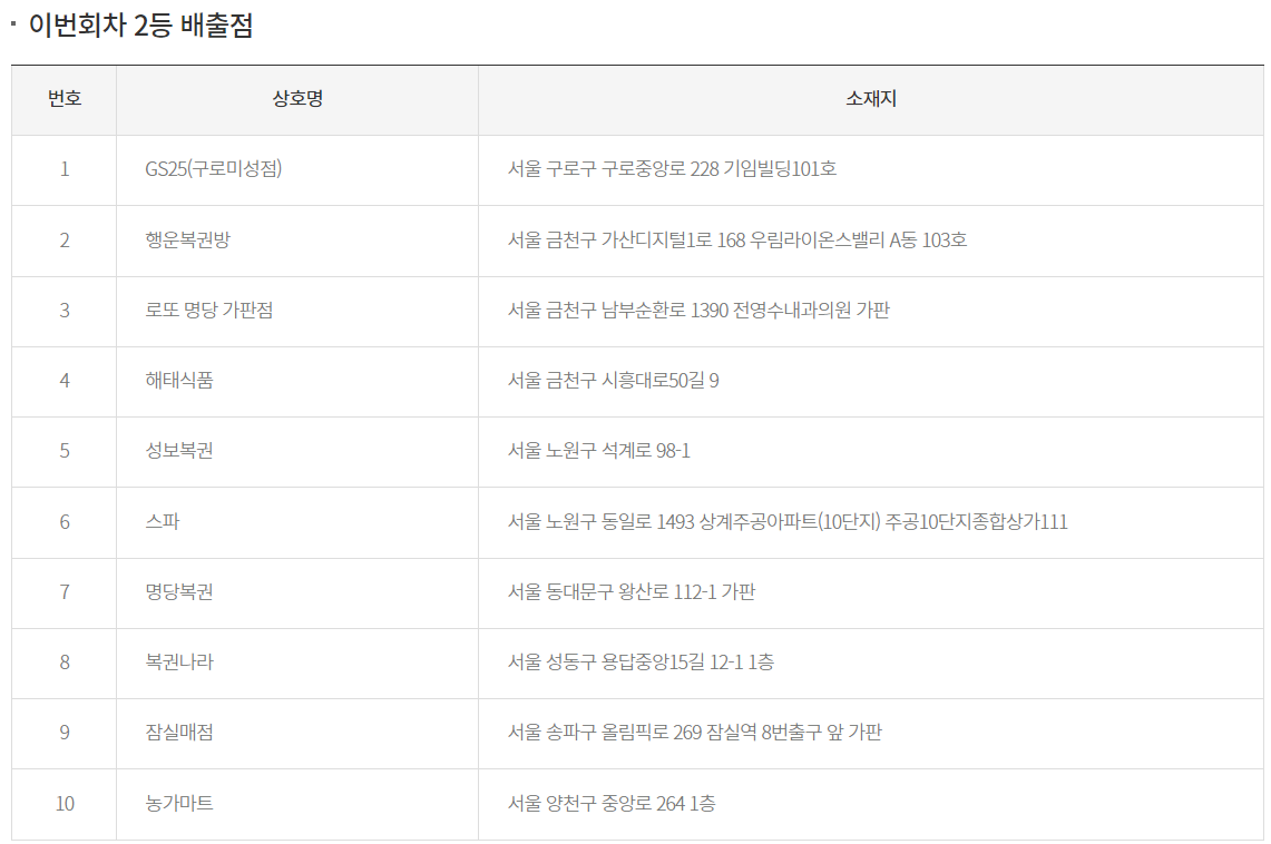 1등, 2등 당첨지역 당첨판매점은 아래와 같습니다.