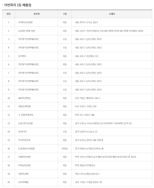 1등, 2등 당첨지역 당첨판매점은 아래와 같습니다.