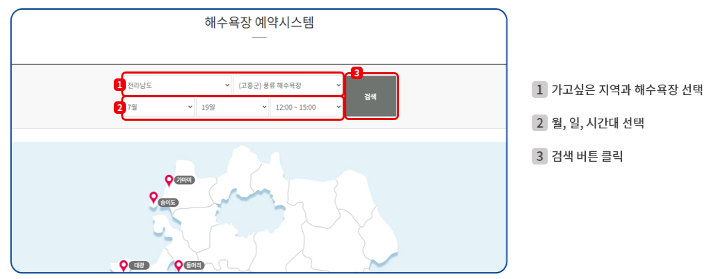 가고 싶은 지역과 해수욕장을 선택합니다. 월, 일, 시간대를 선택합니다.