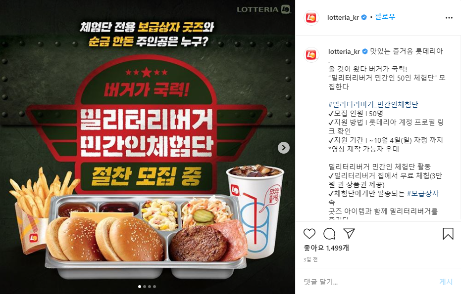 롯데리아 신제품 밀리터리 버거 출시 롯데리아에서 신메뉴 밀리터리 버거를 출시하였습니다. 최초 경험자들도 진짜 사나이라는 프로에서 본 적이 있으셨을 텐데요. 집에서 침 흘리던 맛 롯데리