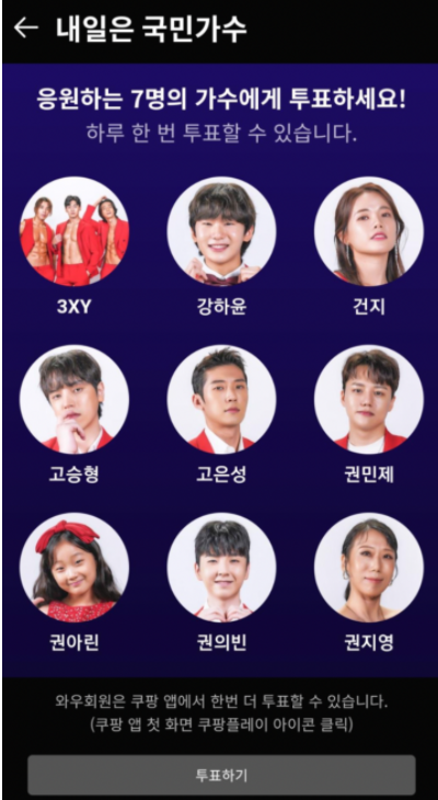 내일은 국민가수 공유 우측에 투표하기 버튼을 클릭하면 응원하는 7명의 가수에게 투표할 수 있습니다.