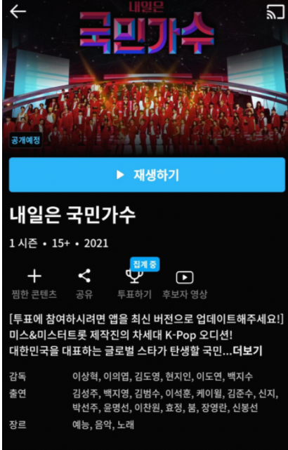 쿠팡플레이는 ‘내일은 국민가수’를 독점으로 라이브 스트리밍 및 VOD 서비스하는 것 외에도 스페셜 미방분 영상들을 모아 방송 직후 독점 공개됩니다.