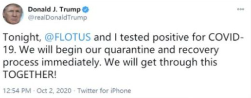 트럼프 대통령은 2일(현지시각) 오전 1시 트위터를 통해 "나와 영부인이 코로나19 양성 판정을 받았다"면서 "즉시 격리하고, 회복 절차를 시작하겠다. 우리는 코로나를 함께 극복할 것"이라고 적었다.
