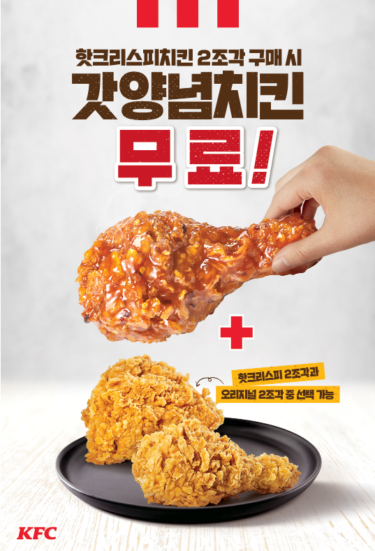 KFC 핫크리스피 2조각 구매 시, 갓 양념치킨 1조각 무료 이벤트 진행