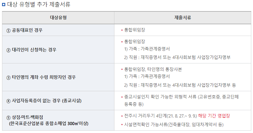 제출서류는 사업자등록증과 통장사본과 함께 허가·신고업종의 경우 영업 허가·신고증이, 자유업종의 경우 고유번호증 등 업종 확인이 가능한 서류가 추가됩니다.