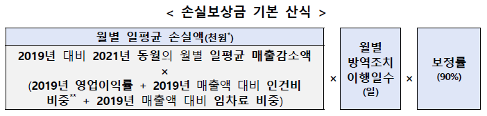 손실보상금 = 월별 일평균 손실액 × 월별 방역조치 이행일수 × 보정률