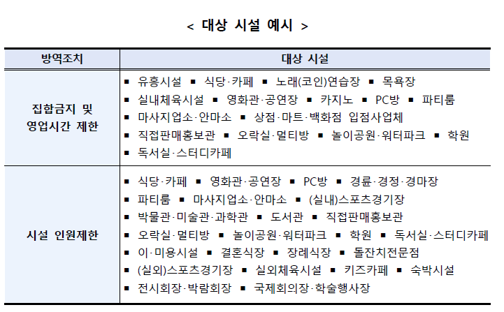 2. (방역조치) 중앙재난안전대책본부 또는 지방자치단체가 「감염병의 예방 및 관리에 관한 법률」(이하 「감염병예방법」) 제49조제1항제2호에 따라 발령한 집합금지, 영업시간제한, 시설인원제한 조치 ※ 그 외의 방역조치(예시 : 사적모임 제한, 다중이용시설 기본 방역수칙)는 「감염병예방법」 제49조제1항제2호에 따른 조치에 해당하지 않음