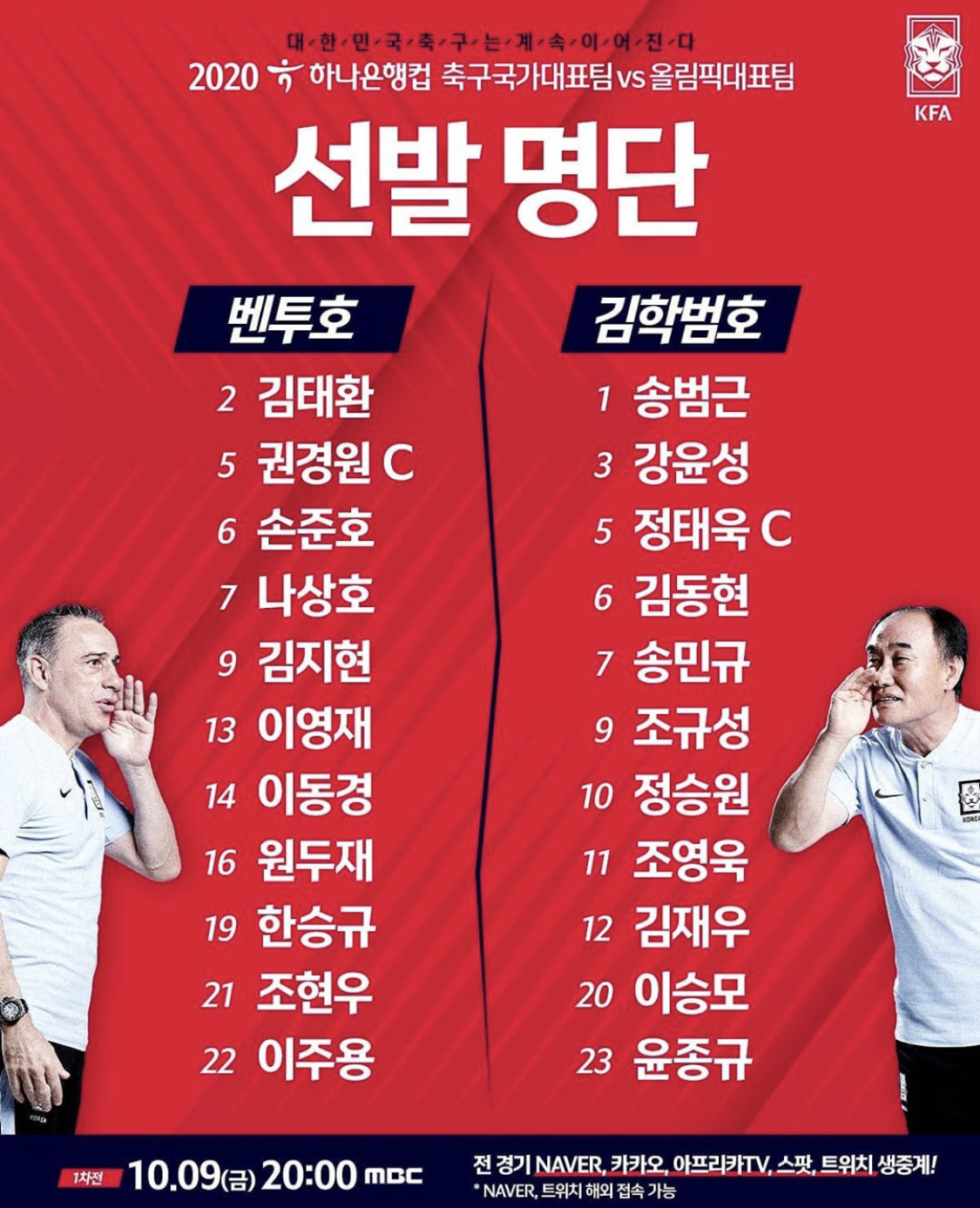 9일 오후 8시 고양종합운동장에서 열리는 2020 하나은행컵 축구국가대표팀vs올림픽대표팀 경기를 앞두고 양 팀 라인업이 공개되었습니다.