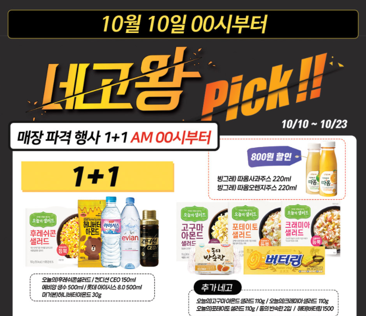 1. 방송일 이후 2주간 5종 상품 (+추가 네고 7종) 1+1 진행(10/10 0시~10/23 24시)