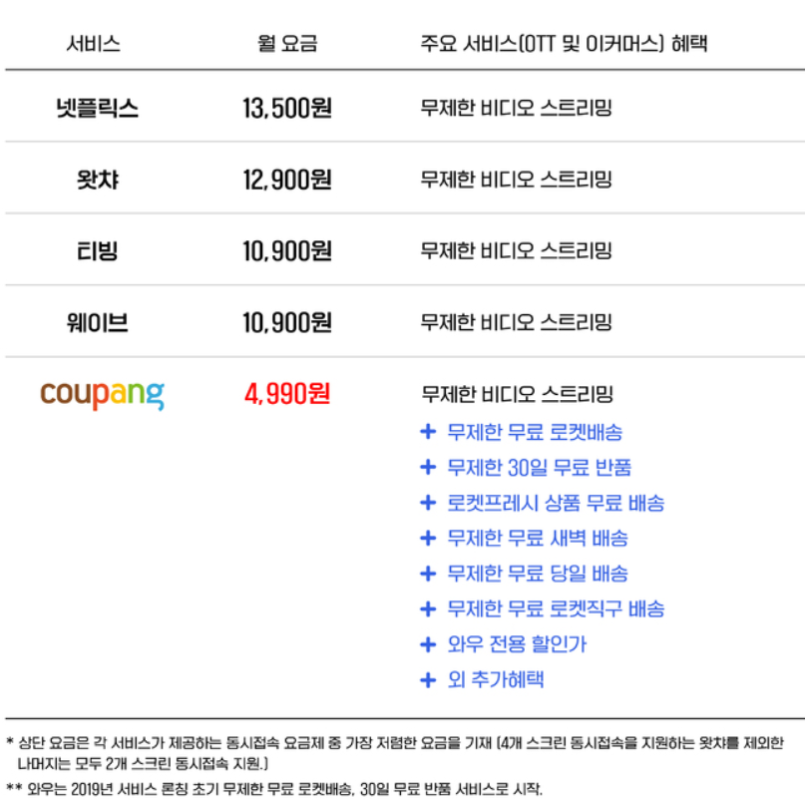 쿠팡플레이 서비스는 일반 고객들에게 완전 무료는 아닙니다. 다만 쿠팡의 로켓와우 멤버십에 가입된 회원들에게 무료로 다양한 컨텐츠를 제공하고 있는 것입니다. 쿠팡은 유료 회원제 '로켓와우'를 선보였는데, 월 4,990원의 멤버십 비용을 지불하면 새벽배송, 당일배송을 무료로 해주는 것입니다.