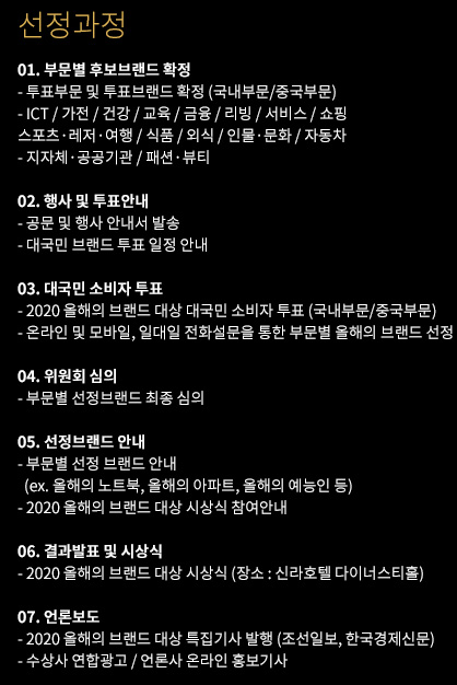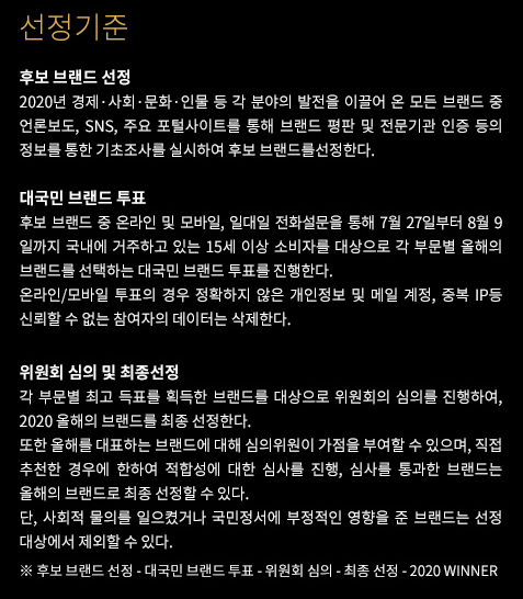 브랜드 선정 기준은 2020 각 분야의 발전을 이끌어 온 모든 브랜드 중 언론보도, SNS, 주요 포털 사이트를 통해 브랜드 평판 및 전문 기관 인증 등의 정보를 통한 기초 조사를 실시하여 후보 브랜드를 선정합니다.