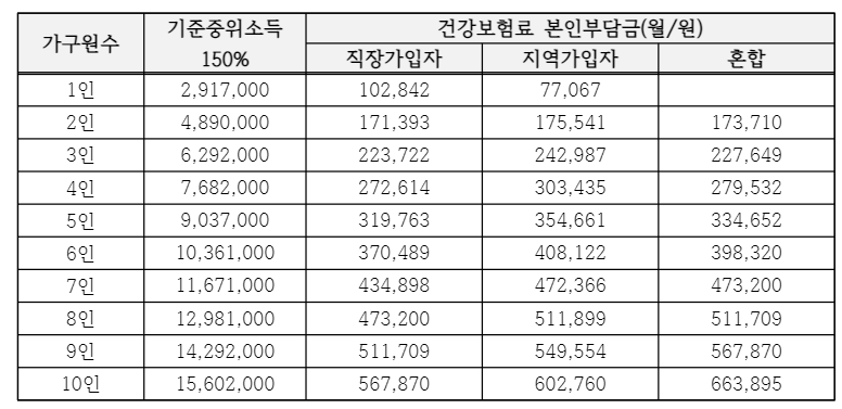 <건강보험료에 의한 기준 중위소득 150% 판정표>