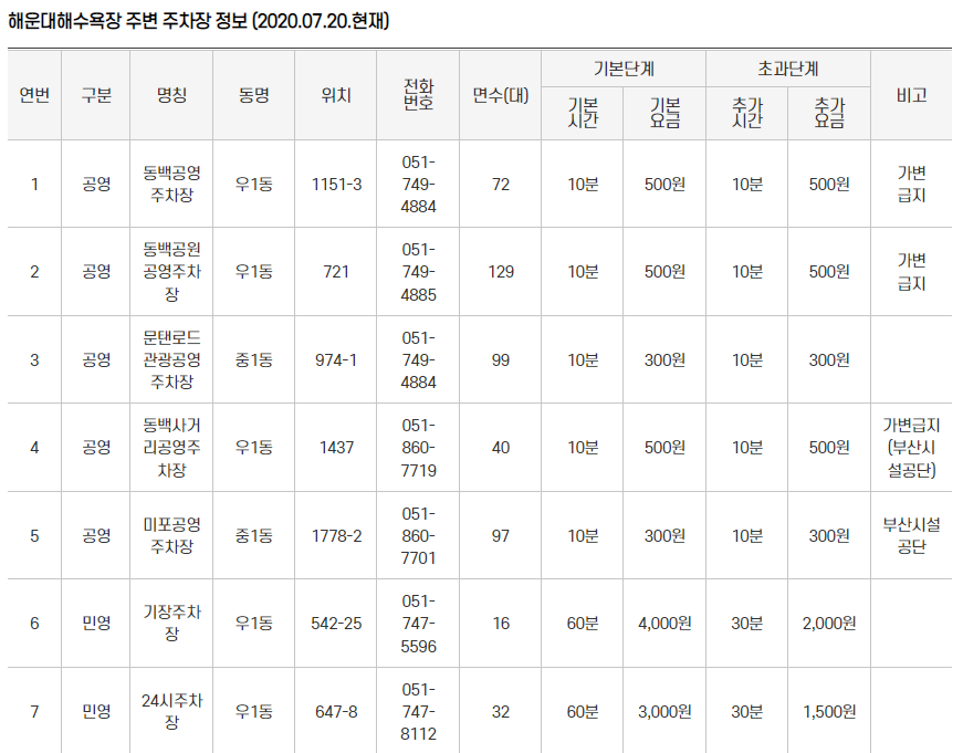 해수욕장 주변 Home 행정 > 교통 > 주차장 정보 > 해수욕장 주변 해수욕장 주변 주차장 정보 해운대해수욕장 주변 주차장 정보 (2020.07.20.현재) 해운대해수욕장 주변 주차장 정보(연번,구분,명칭,동