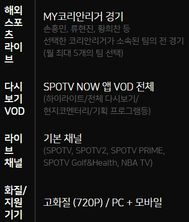 - 모바일/PC + 고화질 + 모든 경기 LIVE + VOD (매월 자동 결제 8,690원, VAT 포함)