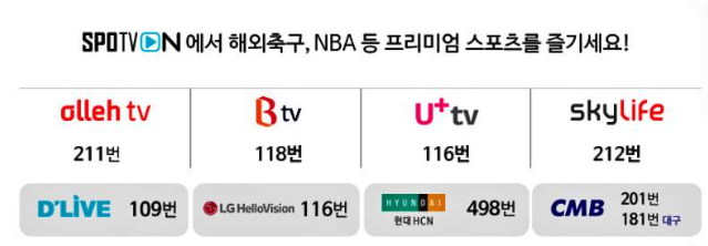 스포티비는 EPL 토트넘 홋스퍼 경기나 혹은 한국인이 출전하는 경기는 무료 생중계였으나 2021년 3월 5일자로 모두 유료로 전환되었습니다. 지난시즌까지는 손흥민 선수의 토트넘 EP경기는 SPOTV 채널을 통해 만나실 수 있었으나 이번 시즌 부터는 유료 TV채널인 SPOTV ON에서 생중계됩니다.