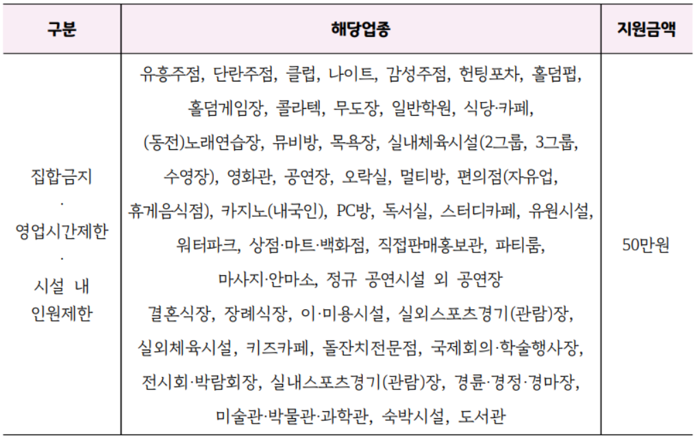 - 집합금지·영업시간제한·시설 내 인원제한 등 행정명령 조치 업종
