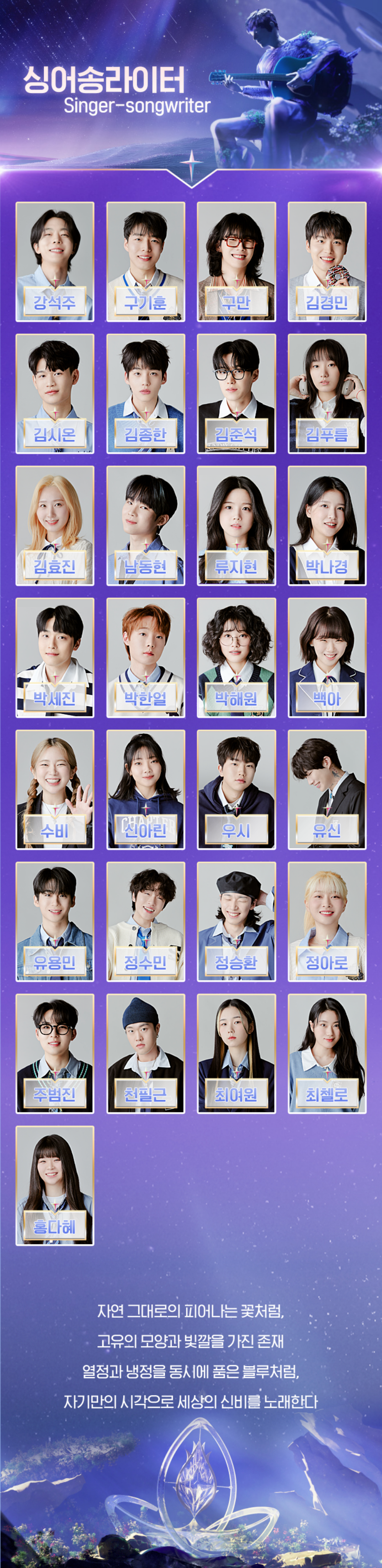 박철환 PD는 “‘청춘스타’는 케이팝을 구성하는 싱어송라이터, 아이돌, 보컬 세 개의 파에서 각각의 재능을 지닌 청춘들이 각각의 파 혹은 다른 파와 배틀을 벌이고 성장하며 청춘스타의 자리에 오르는 리얼리티가 담긴 스토리가 될 것”이라고 밝히고 있습니다.