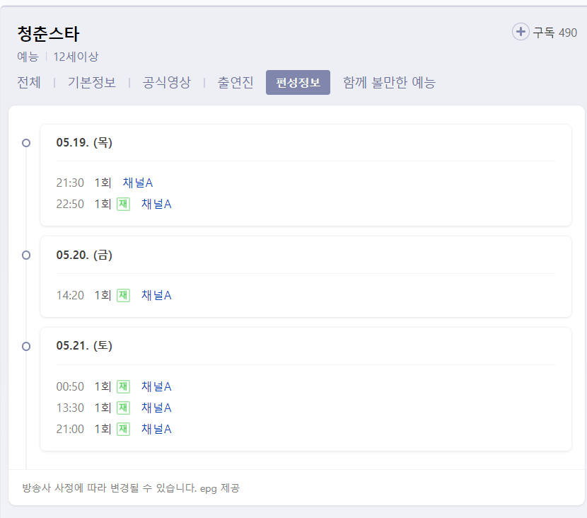 채널 A 청춘스타 재방송 다시보는 방법은 첫번째 포털 검색 사이트에서 '청춘스타 재방송'으로 검색하시면 편성표 정보를 확인 하실 수 있습니다.
