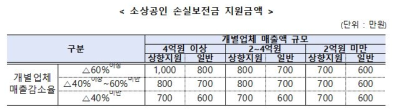 국회를 통과한 추경안은 소상공인의 매출액·피해 수준과 업종별 특성 등을 고려해 600만원에서 최대 1천만원까지 손실보전금을 지급하는 내용을 포함하고 있습니다. 여야 합의로 지급대상 매출액 기준이 당초 정부안인 '30억원 이하'에서 '50억원 이하'로 확대됐으며, 지원 대상이 370만 곳에서 371만 곳으로 늘어났습니다.