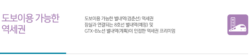 도보이용 가능한 역세권! 잠실과 연결되는 8호선 별내역(예정)으로 서울 수도권과 연결되는 최적의 교통망을 자랑합니다.
