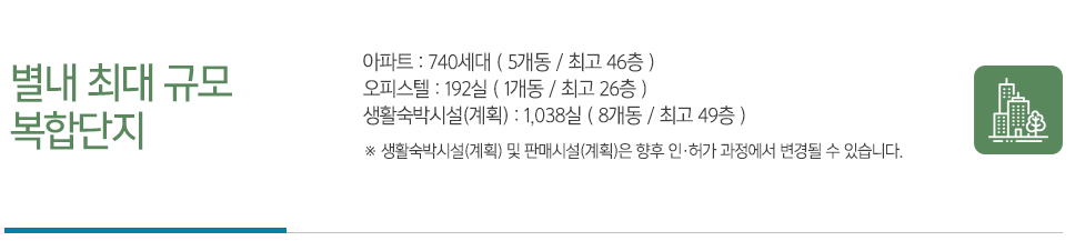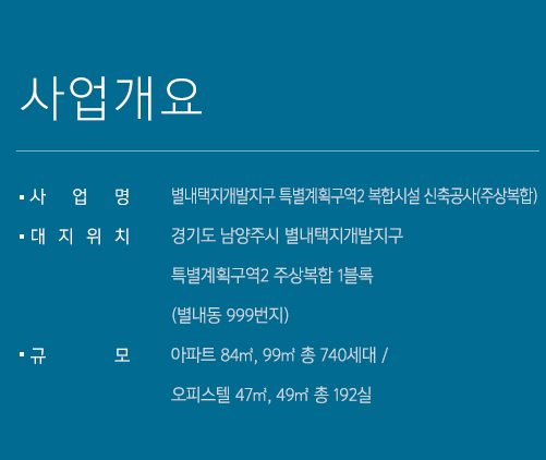 아파트 지하 3층, 최고 지상 46층, 전용면적 84㎡, 99㎡ 총 740세대와 오피스텔 지하 3층, 지상 26층, 전용면적 47㎡, 49㎡ 총 192실로 구성되어 주거 복합 단지로 탄생할 예정입니다.
