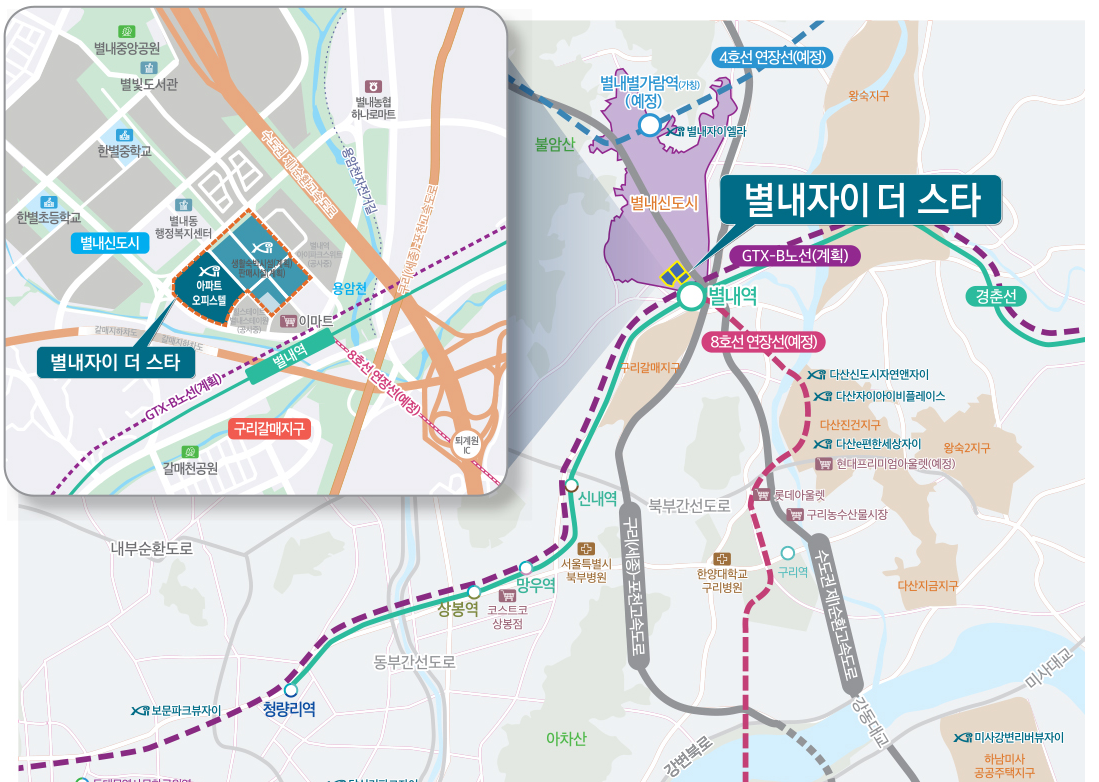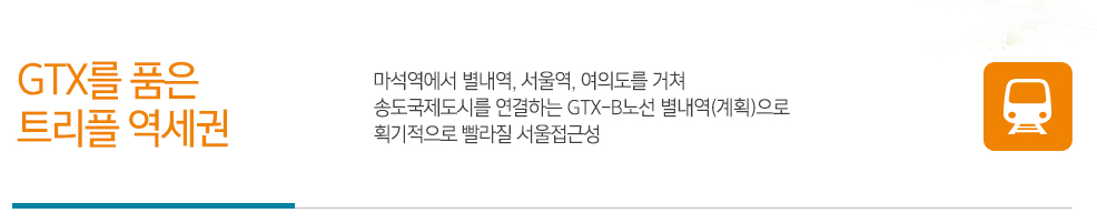 마석역에서 별내역, 서울역, 여의도를 거쳐 송도국제도시를 연결하는 GTX-B노선 별내역(계획)으로 획기적으로 빨라진 서울 접근성이 강점입니다.