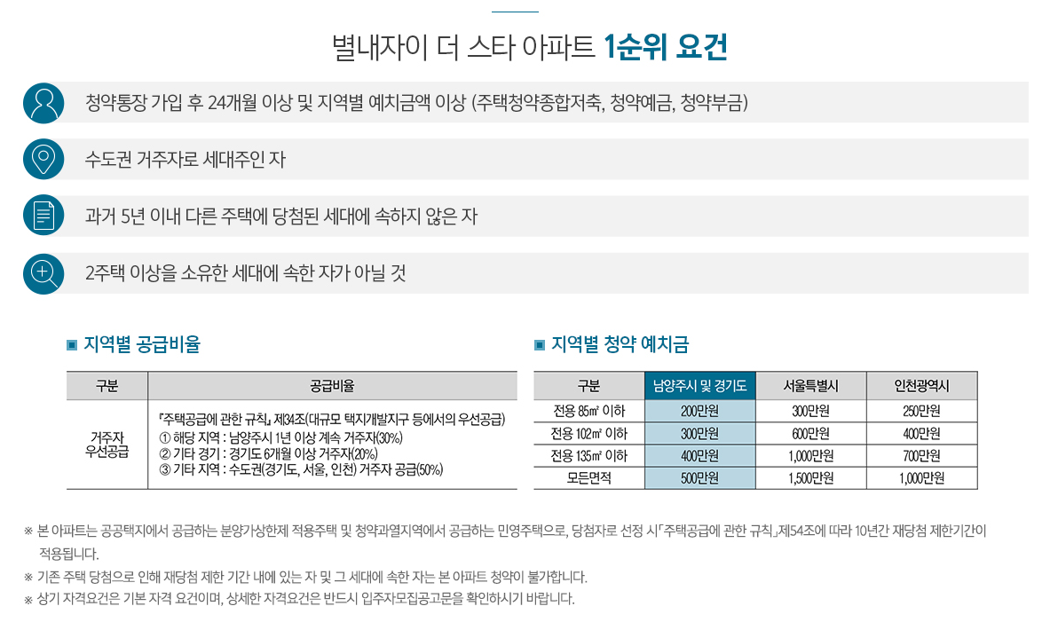 별내자이더 스타는 수도권(서울, 경기, 인천) 전 지역에서 1순위 청약이 가능하고, 전용 84㎡ 일반공급 물량 25%, 전용 99㎡ 일반공급 물량 70%가 추첨제로 진행돼 청약저가점자들도 당첨을 노려볼 수 있으며, 1주택자도 청약이 가능합니다.