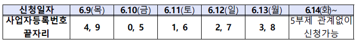 - (신청분산) 6.9일(목)부터 6.13일(월)까지 첫 5일간 사업자등록번호 끝자리 기준으로 5부제 시행, 6.14일(화)부터는 사업자등록번호 끝자리와 관계없이 신청