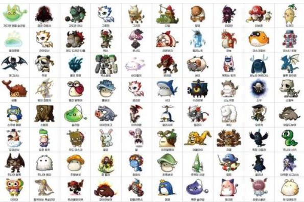 총 80종이 있으며, 인기 있는 종은 주황버섯, 슬라임, 돌의 정령, 핑크빈, 예티, 그리고 아이언 호그입니다.