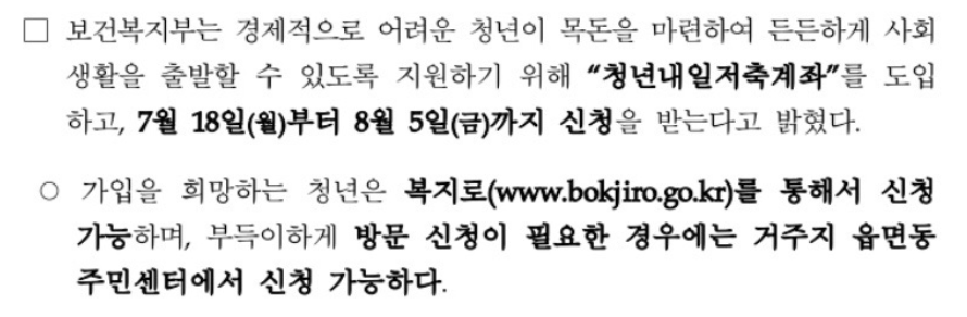 정부는 청년내일저축계좌를 도입하고, 7월 18일(월)부터 8월 5일(금)까지 신청을 받는다고 밝혔습니다. 가입을 희망하는 청년은 복지로 신청 가능하며, 부득이하게 방문 신청이 필요한 경우에는 거주지 읍면동 주민센터에서 신청 가능하다고 합니다. 자세한 내용을 살펴보도록 하겠습니다.