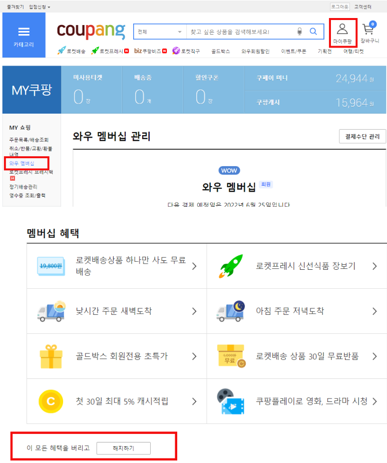 [PC 앱에서 쿠팡 와우 맴버십 회원 탈퇴 방법]