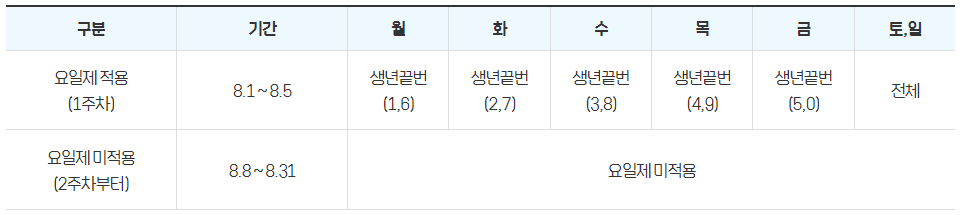 5부제 적용 : 8. 1. ~ 8. 5. 09:00 ~ 22:00