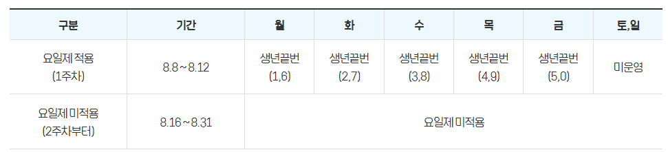 5부제 미적용 : 8. 8. ~ 8. 31. 09:00 ~ 22:00