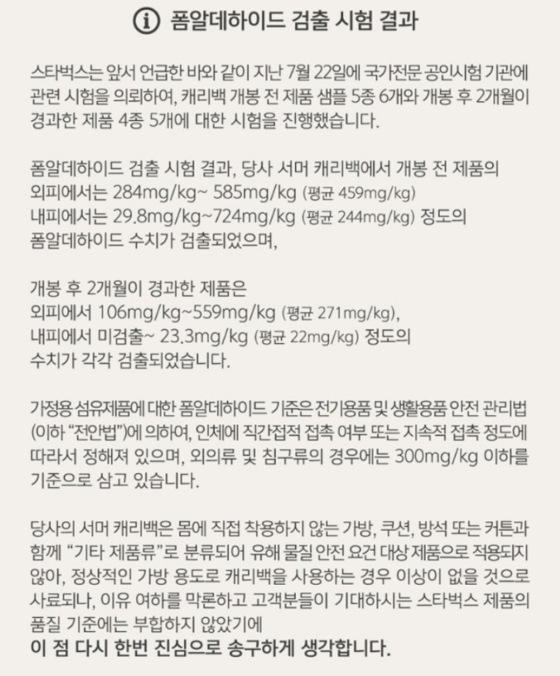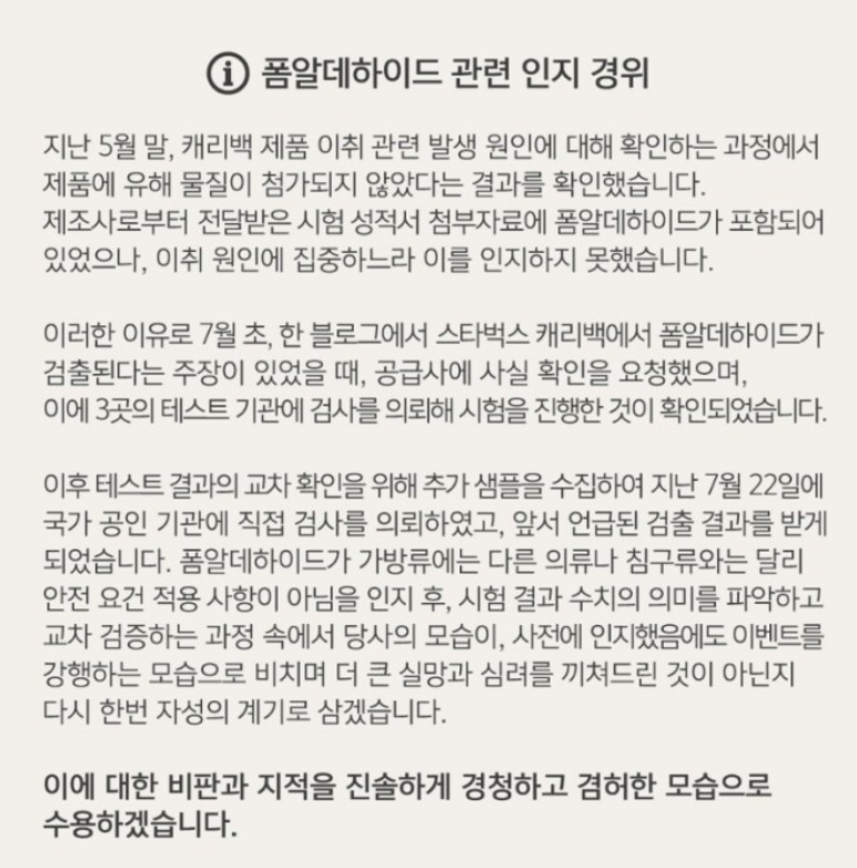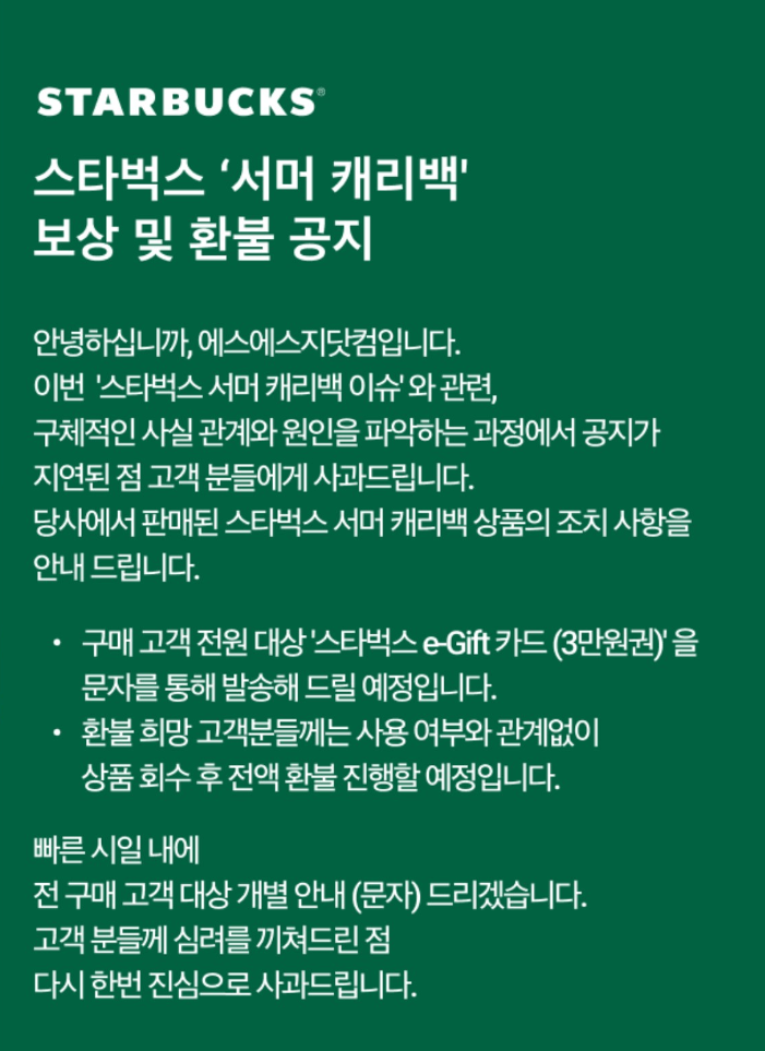 스타벅스코리아는 전일 서머 캐리백에서 1급 발암물질인 폼알데하이드가 일부 검출됐다는 사실을 인정하고 공식 사과했습니다. 이에 스타벅스 서머 캐리백에 대한 환불 또는 교환 조치가 있을 예정입니다. 구체적으로 어떻게 지급되는 지 살펴보도록 하겠습니다.