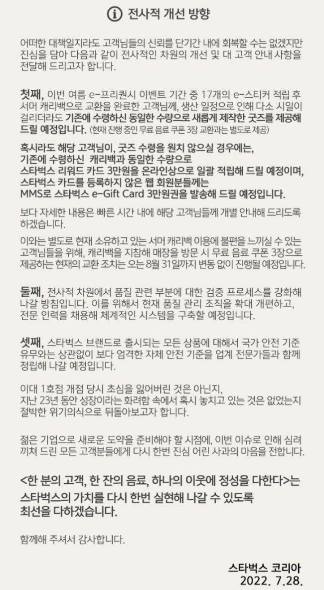 스타벅스는 이에 대한 보상안으로 매장에 캐리백을 반납 시 무료 음료 3잔 교환권을 지급하기도 했습니다. 이와 별도로 리워드 3만원권이나 새로운 굿즈도 지급됩니다.