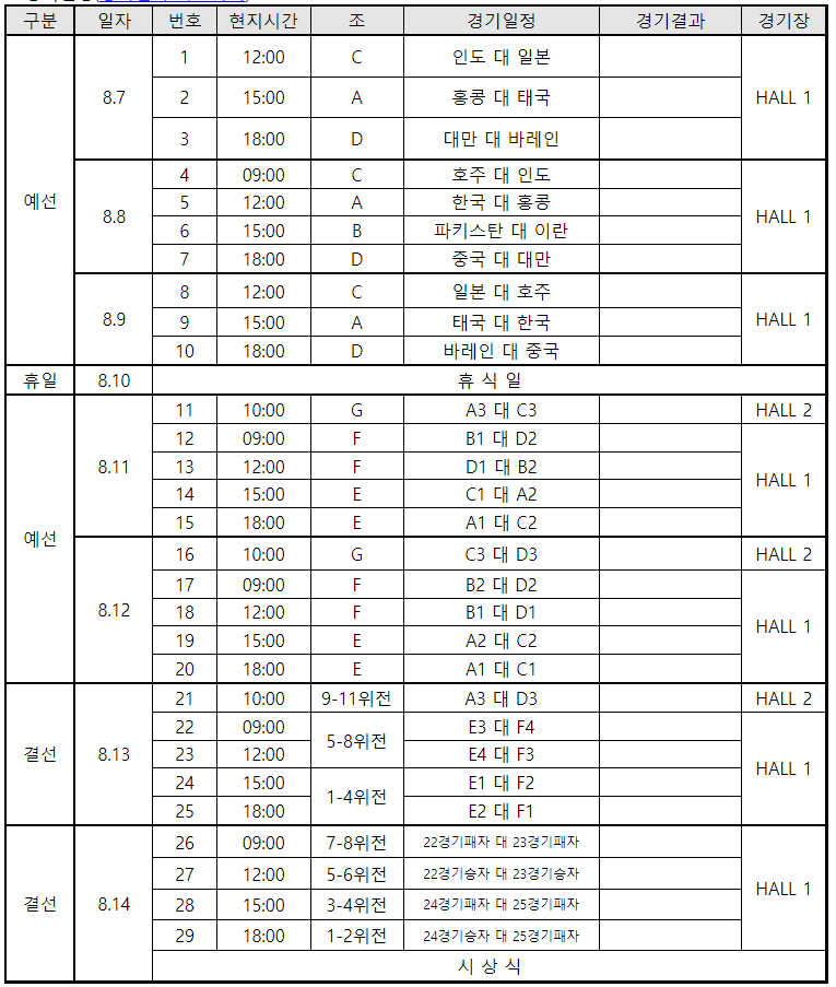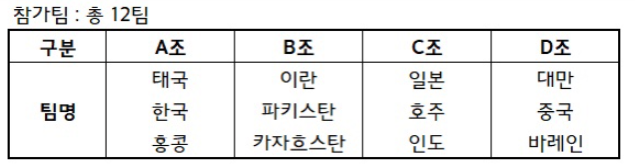 한국은 태국, 홍콩과 함께 A조에 속했습니다. 8일 홍콩과 조별리그 첫 경기를 치르고 9일 태국전이 이어집니다. 조별리그가 끝나면 2차 조별예선이 바로 시작됩니다. 대회 폐막은 14일인데 하루만 빼고 일주일에 6차례 경기를 치러야합니다.